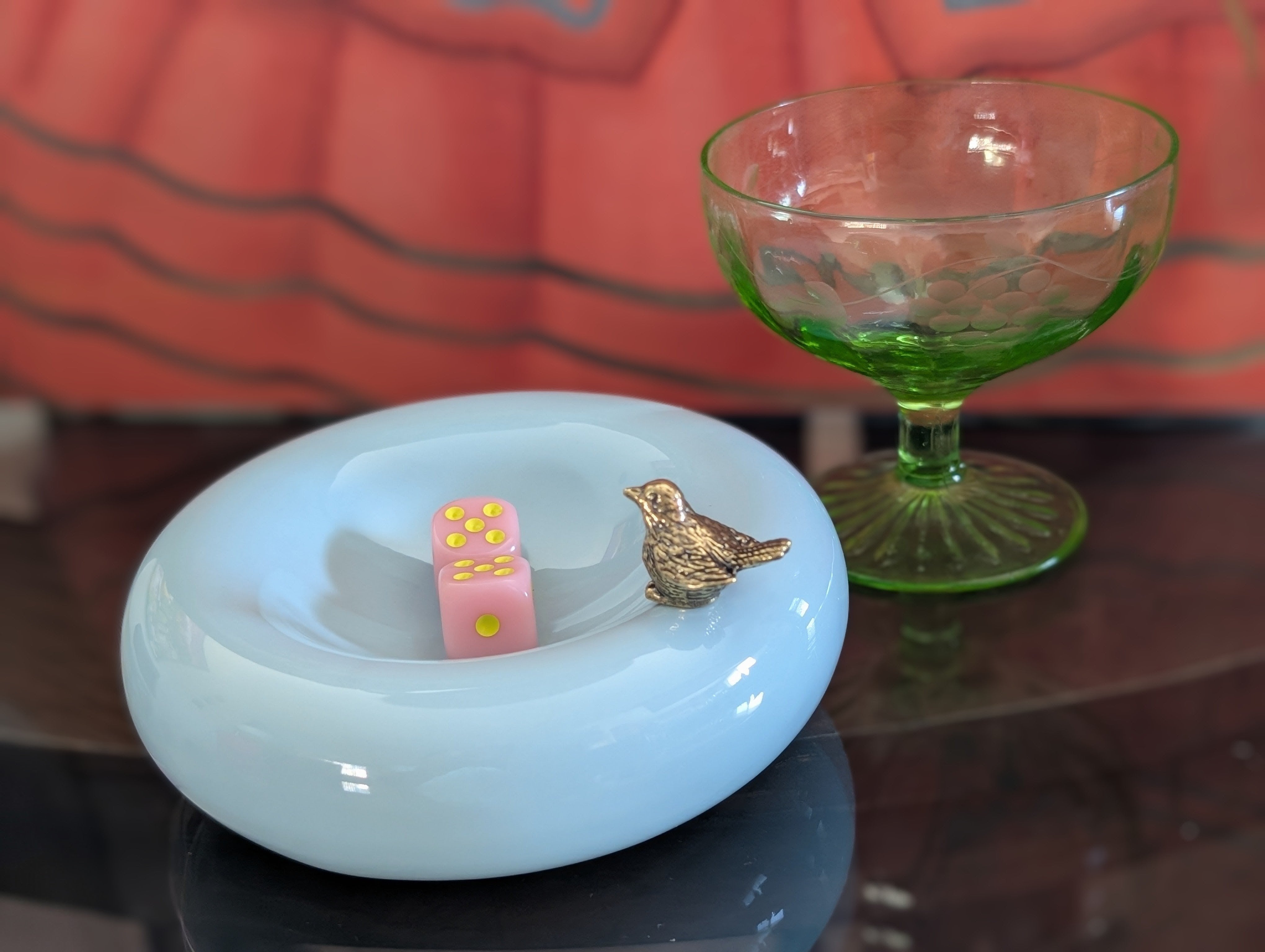 A cute ceramic doughnut shaped bowl with a small brass sparrow perched on the edge serves as the perfect table top companion to hold your dice or snacks for you mahjong game. Light blue glossy 5 in diameter by 1.5 in high. Tweet tweet- mahj on!